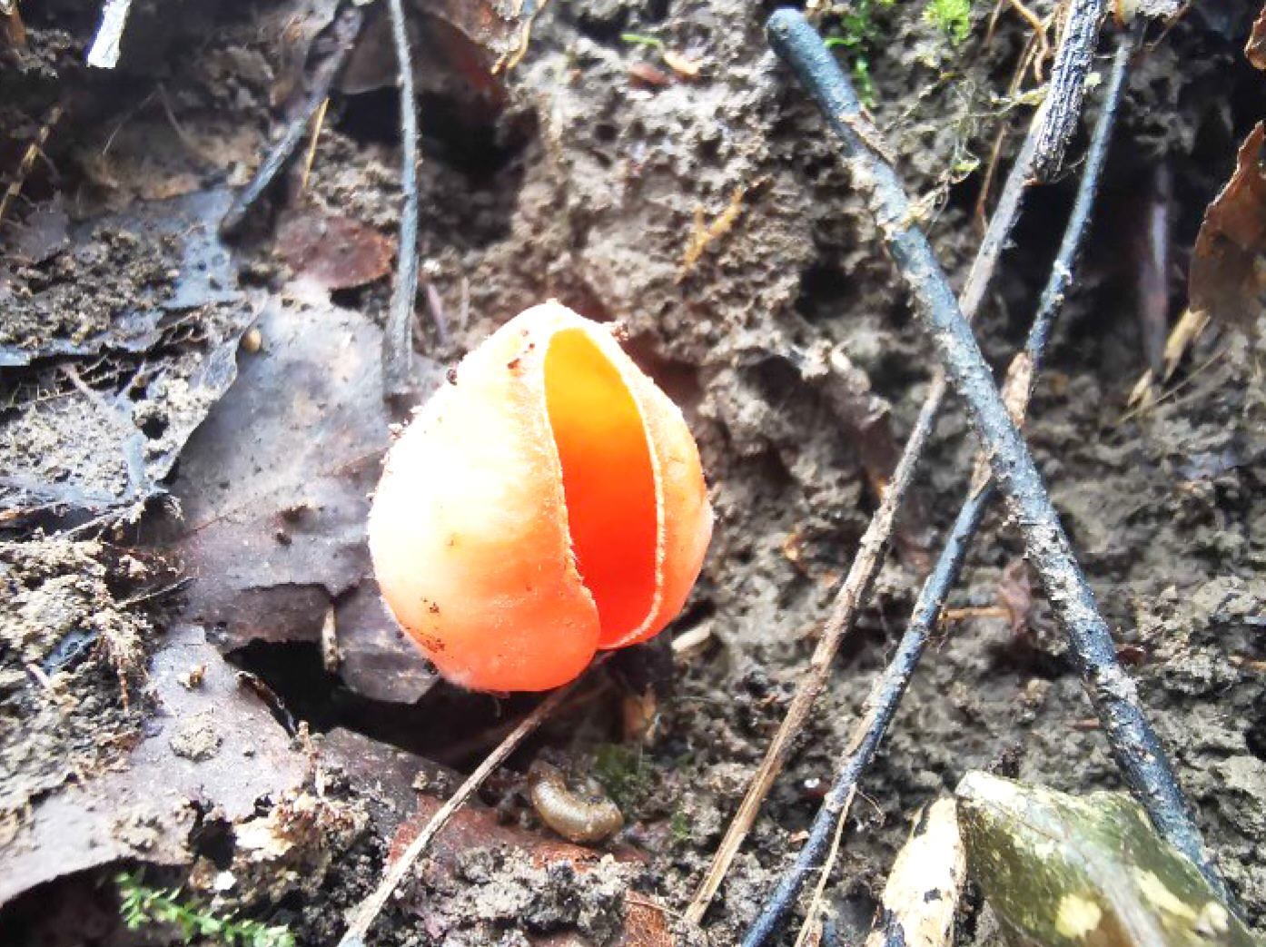 Namensgeber: Scharlachroter Kelchbecherling am Schachtrand".