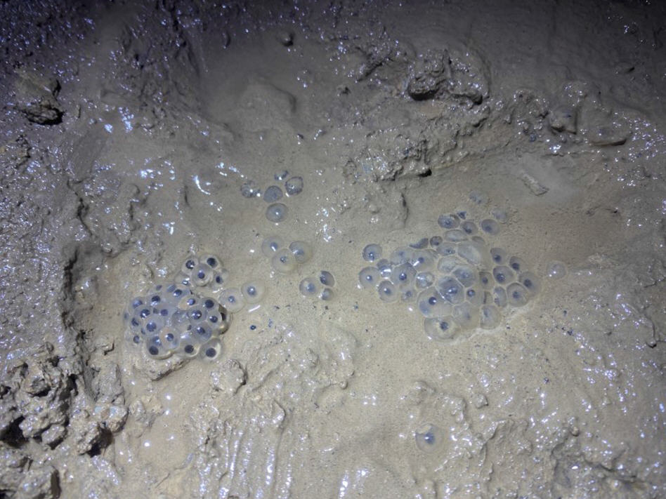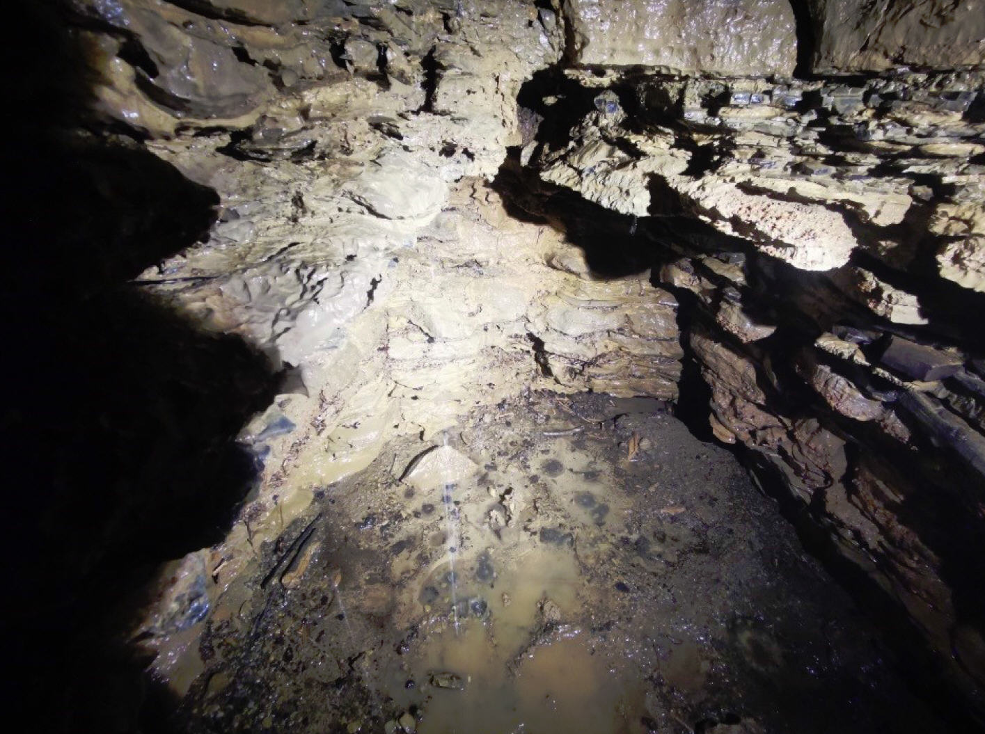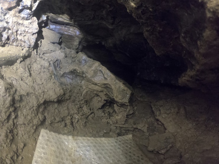 Endhalle mit Schlammsediment und toter Kröte rechts unten im Bild